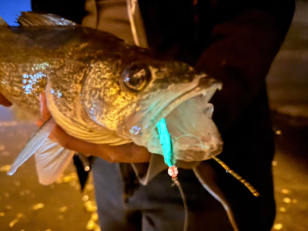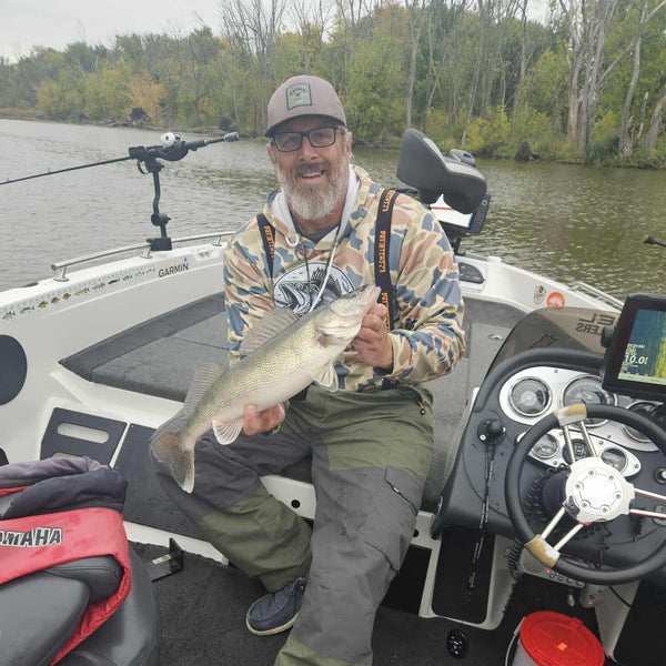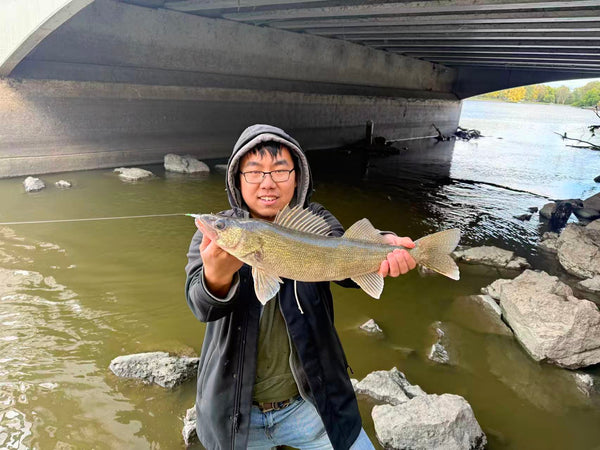 Outdoor Habits landing walleye using our collaboration Bucktail flies on the Rock River.